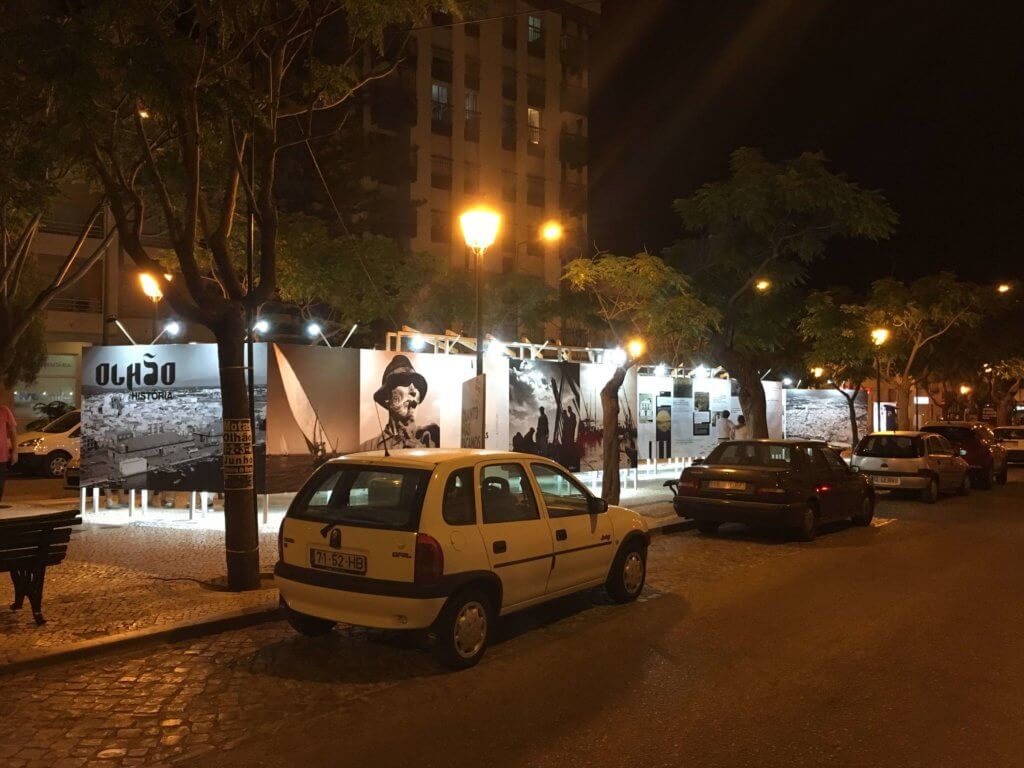 Patente na avenida da República, palco de bruscas e dramáticas mutações ocorridas em particular nas últimas décadas (continuando ainda hoje o tenso jogo entre o pré-existente e o desejo de nova construção) encontra-se a exposição Olhão com História em cuja existência agradavelmente se ‘tropeça’.Olhão, terá para a esmagadora maioria das pessoas duas entradas/ saídas, porém o que de facto acontece é a existência de uma infindável multiplicidade de vias comunicantes com o território a si contíguo.O mesmo acontece a quem chega a olhão com história que apesar de projectado ao longo de uma vasta linha temporal cada núcleo possibilita uma válida leitura individual.À imagem e semelhança da malha urbana de Olhão mais antiga e popular, este projecto secciona-se por conjuntos de painéis, uns mais avançados, outros mais recuados, obrigando ainda o visitante a também dar a volta em apertado cotovelo.Em caso de rijo sol se encontrar presente, abrigo poderá ser encontrado à ravessa de contíguos painéis. De costas para alguma informação, mas de frente para outra, tal como acontece quando nos deslocamos nas ruelas da barreta.Os barrotes de madeira (servindo estes de suporte à iluminação e ao mesmo tempo reforçando a estrutura) sobre alguns painéis projectando nas mesmas sombras bem delineadas, cuja existência é paralela à das sombras projectadas pelas habitações nas ruas e fachadas a si contíguas, rodando ao longo do dia.